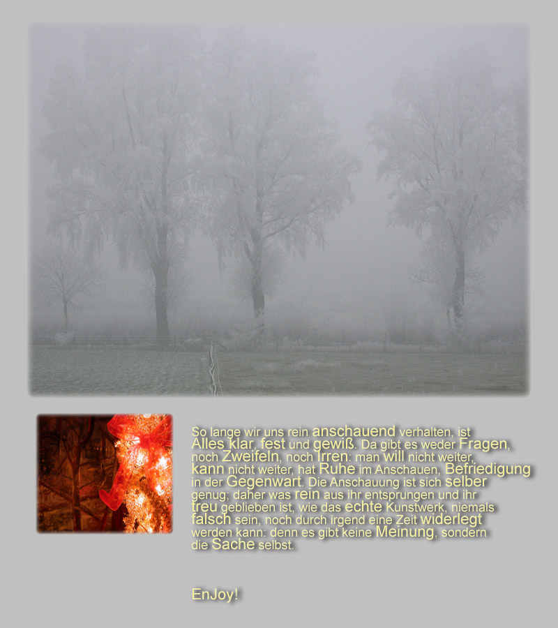Zin in een wereldbeeld – De tijdruimte van het wereldbeeld kondigt zich aan als het ons lukt om ons in een staat van niets-doen en niets-willen over te geven aan de rustige blik van een eenvoudige zintuiglijke waarneming. Waar die waarneming tot een aandachtig beschouwen wordt mogen we hopen op een wereldbeeld. Het ontstaan van dat wereldbeeld dan is als een feestelijke intocht waarbij we binnentrekken in het beeld, en het beeld in ons. Uiteindelijk bevinden we ons waarlijk, zij het onwerkelijk, in de wereld zoals die waarlijk, zij het onwerkelijk, is.